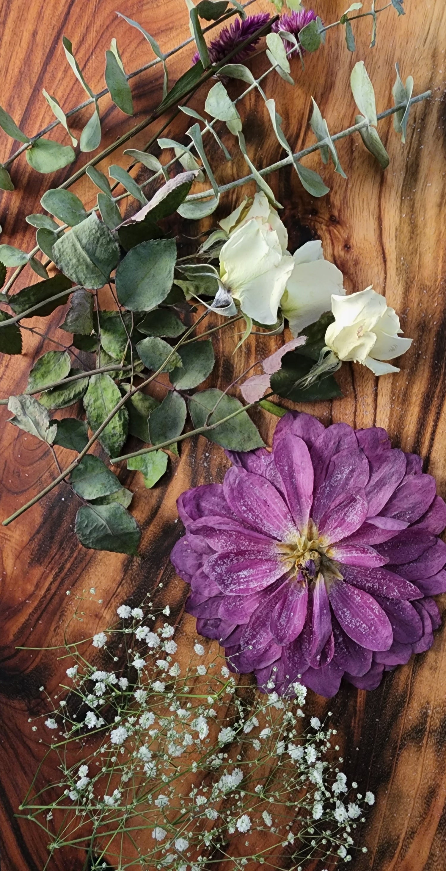 The process for our flower board is very time consuming and completed in stages to ensure the clarity of the resin, as minimal bubbles as possible, and to retain the individual beauty of each and every flower. This stage takes between 3-4 weeks.