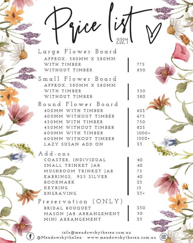 We are here to discuss your vision and what components we can make happen for you. If there is not enough flowers in your arrangement to fill a board, we will recommend adding timber or other fillers to complete the look.