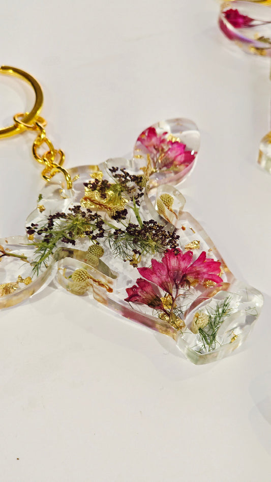 Preserved Flowers in Resin with Coral Bells, Chocolate Queen Annes Lace and Gold Flakes set in Cow Head Keyring