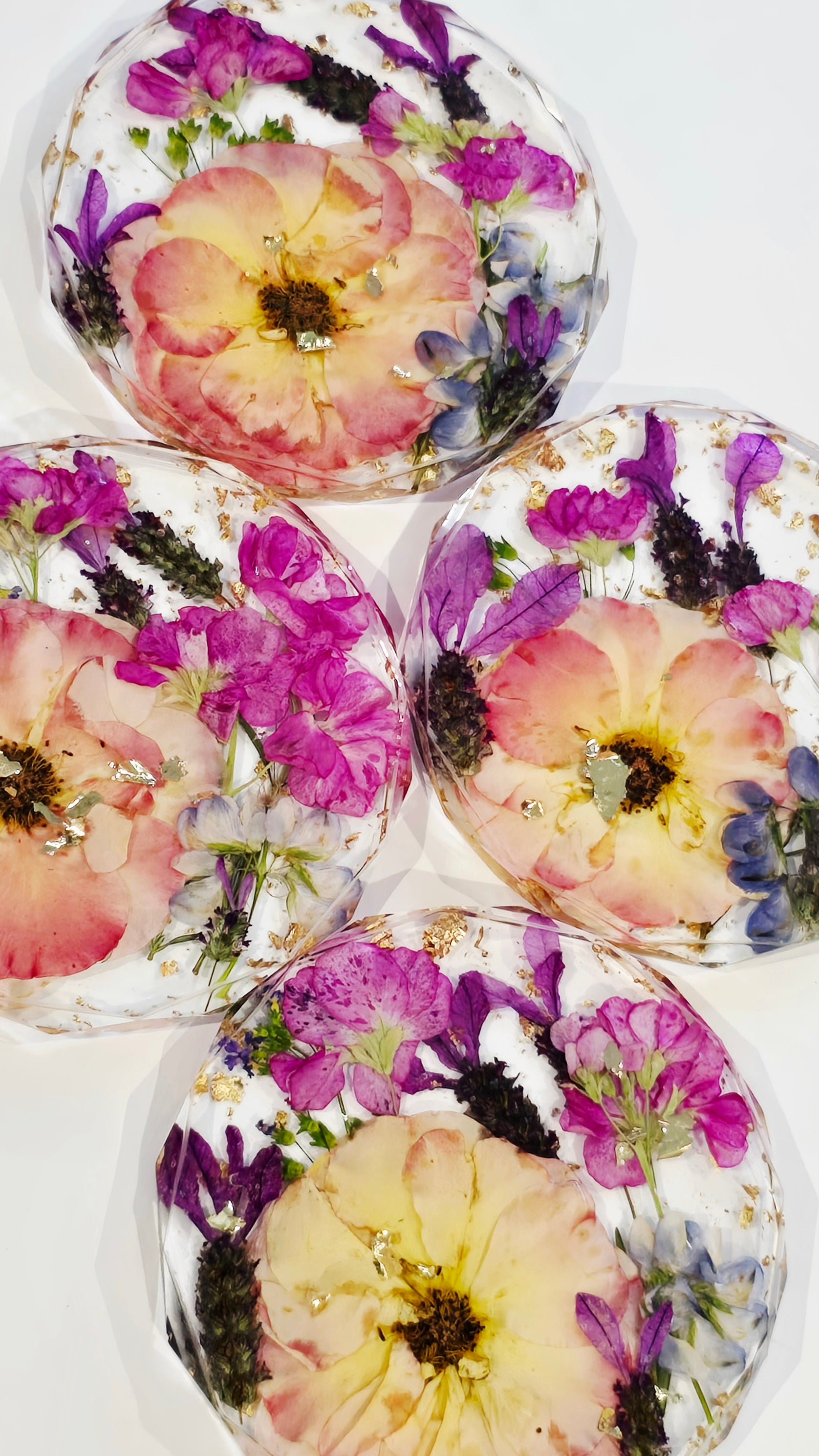 Coaster Set featuring David Austin Roses, Lavender, Primula, Stock & Gold Flakes set in Resin, Set of 4