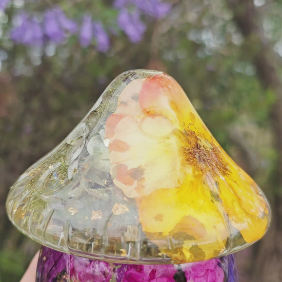 #100 - Bring a touch of whimsy and natural beauty into your home with this handcrafted mushroom trinket jar, featuring real preserved flowers embedded in crystal-clear resin. Each jar is a miniature garden, with vibrant blooms encapsulated in the lid and base, making every piece truly one-of-a-kind.