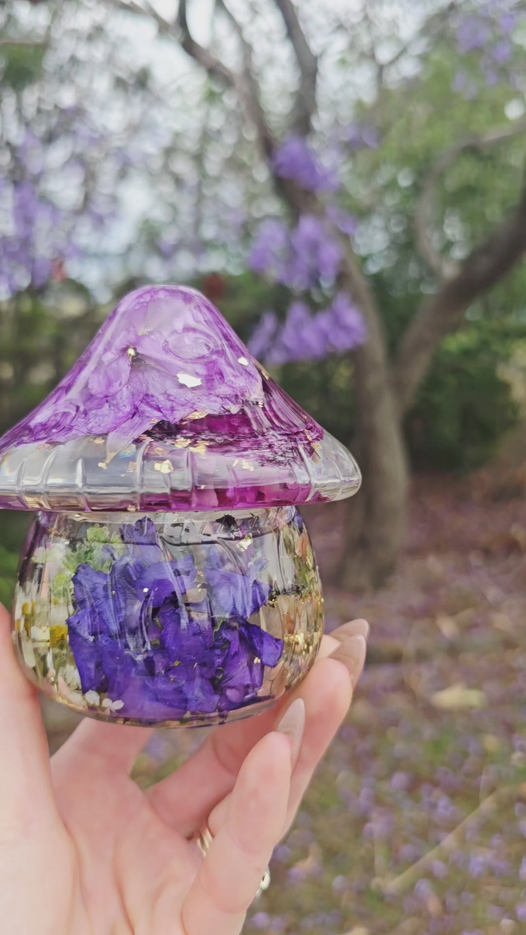 Mushroom Trinket Jar featuring Real Preserved Dahlia, Rose, Delphinium, Larkspur, Snapdragon, Lavender & Chamomile set in resin