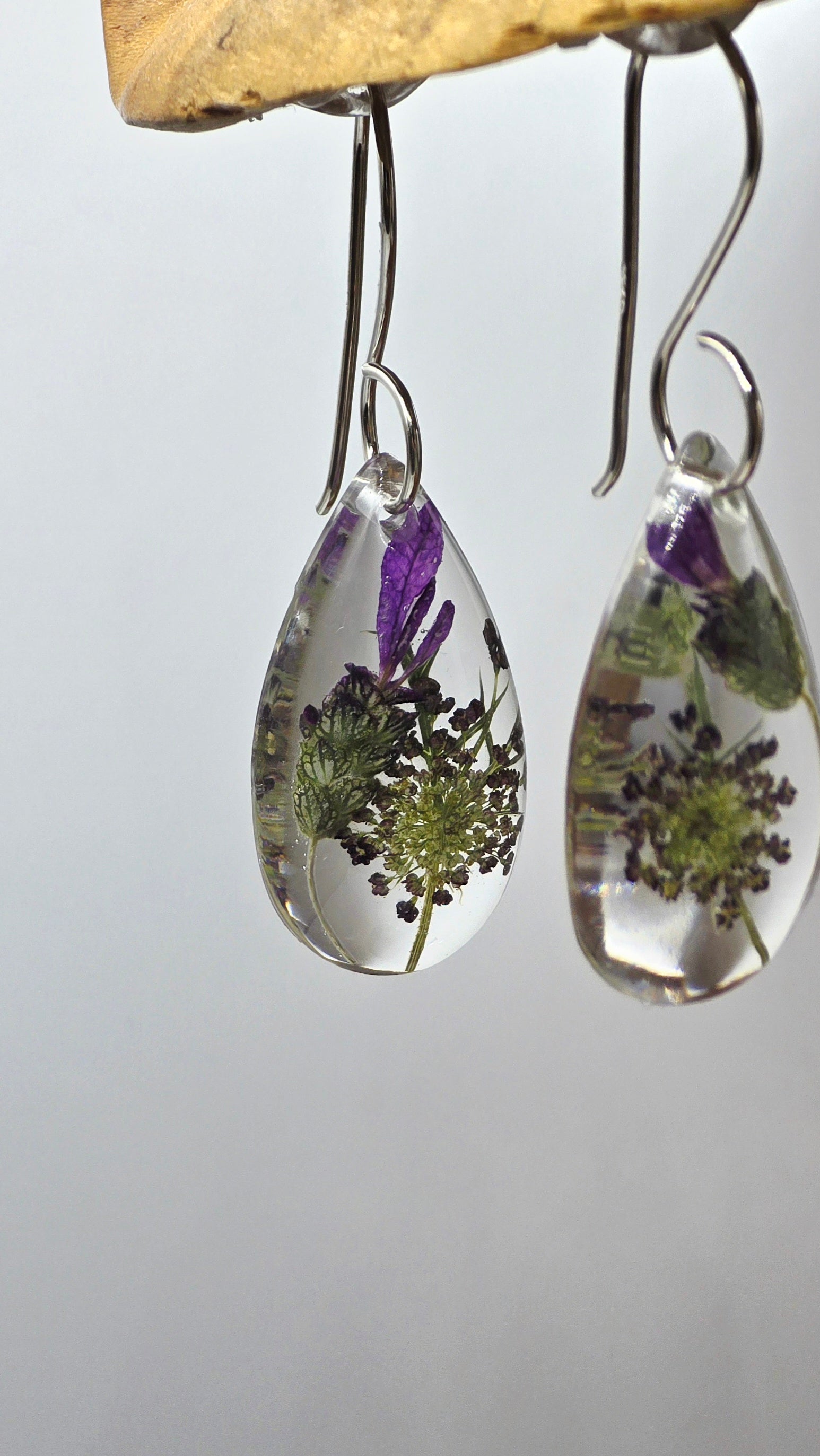 Each pair features a one-of-a-kind arrangement of real preserved wildflowers, delicately suspended in a teardrop-shaped resin pendant and accented with shimmering clarity. The flowers are carefully selected and preserved to retain their natural colour and form, creating miniature gardens that celebrate the fleeting beauty of nature.