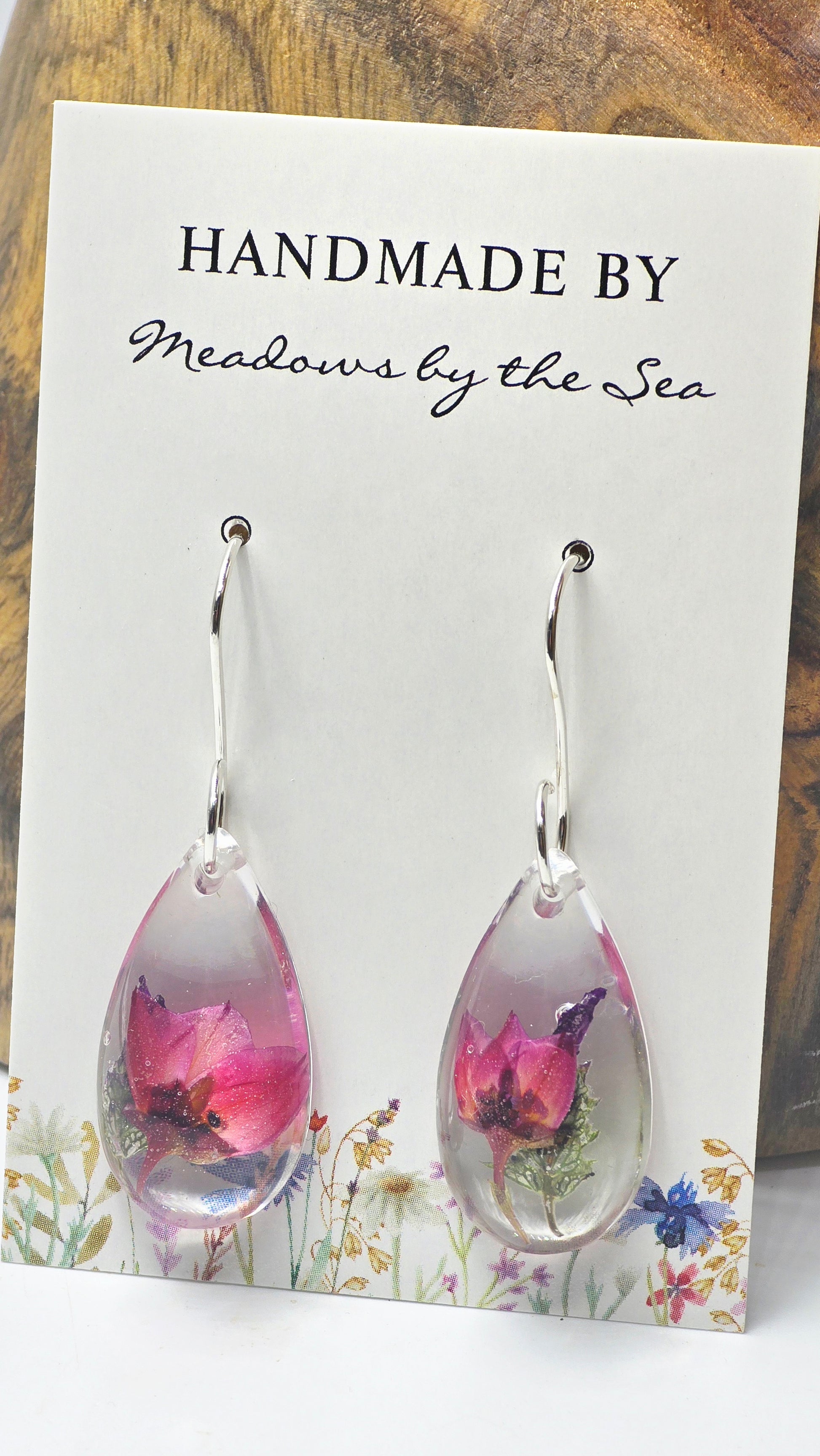 Each pair features a one-of-a-kind arrangement of real preserved wildflowers, delicately suspended in a teardrop-shaped resin pendant and accented with shimmering clarity. The flowers are carefully selected and preserved to retain their natural colour and form, creating miniature gardens that celebrate the fleeting beauty of nature.