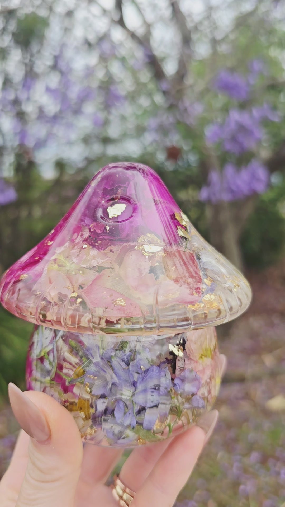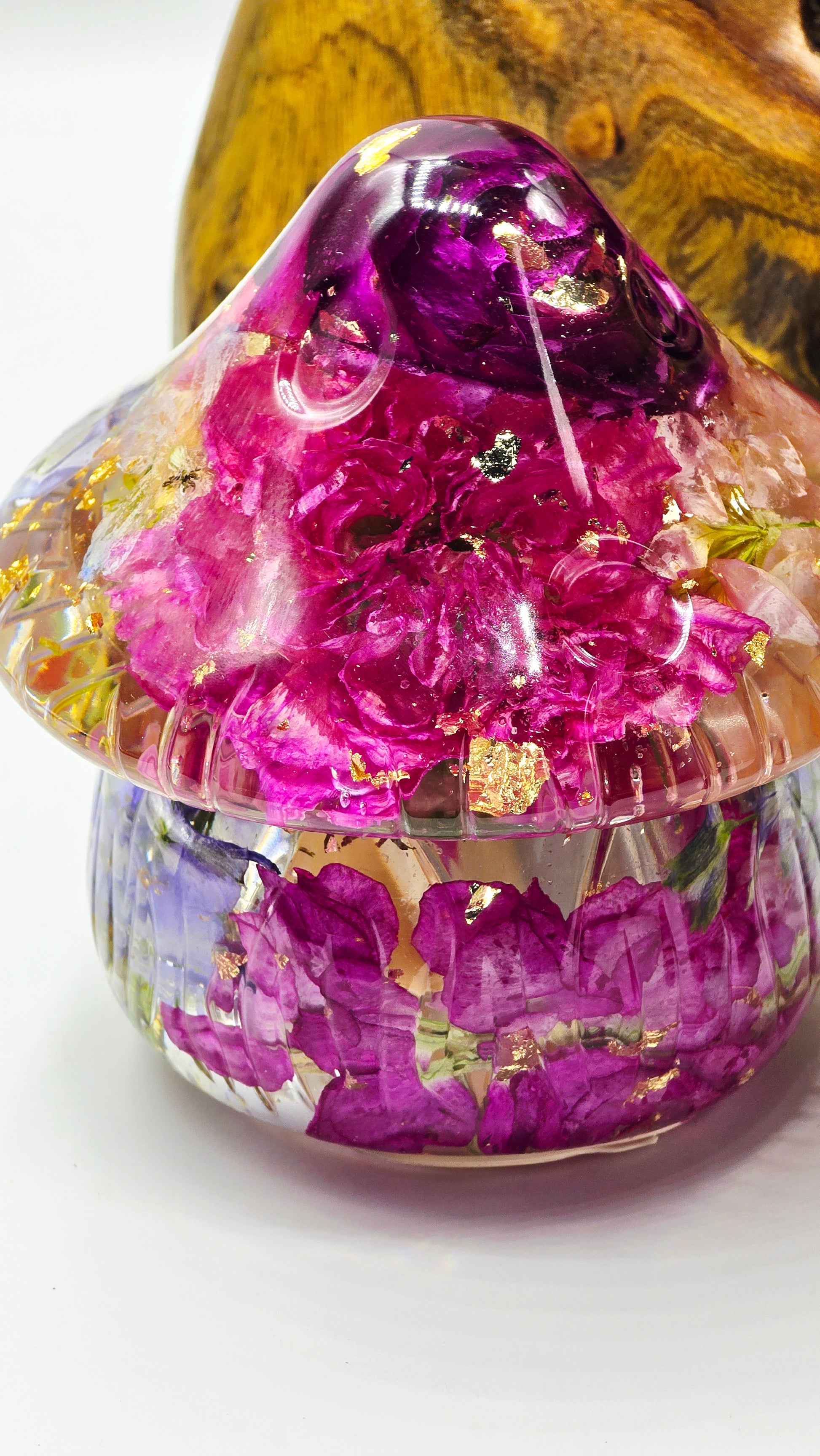 #102 - Bring a touch of whimsy and natural beauty into your home with this handcrafted mushroom trinket jar, featuring real preserved flowers embedded in crystal-clear resin. Each jar is a miniature garden, with vibrant blooms encapsulated in the lid and base, making every piece truly one-of-a-kind.