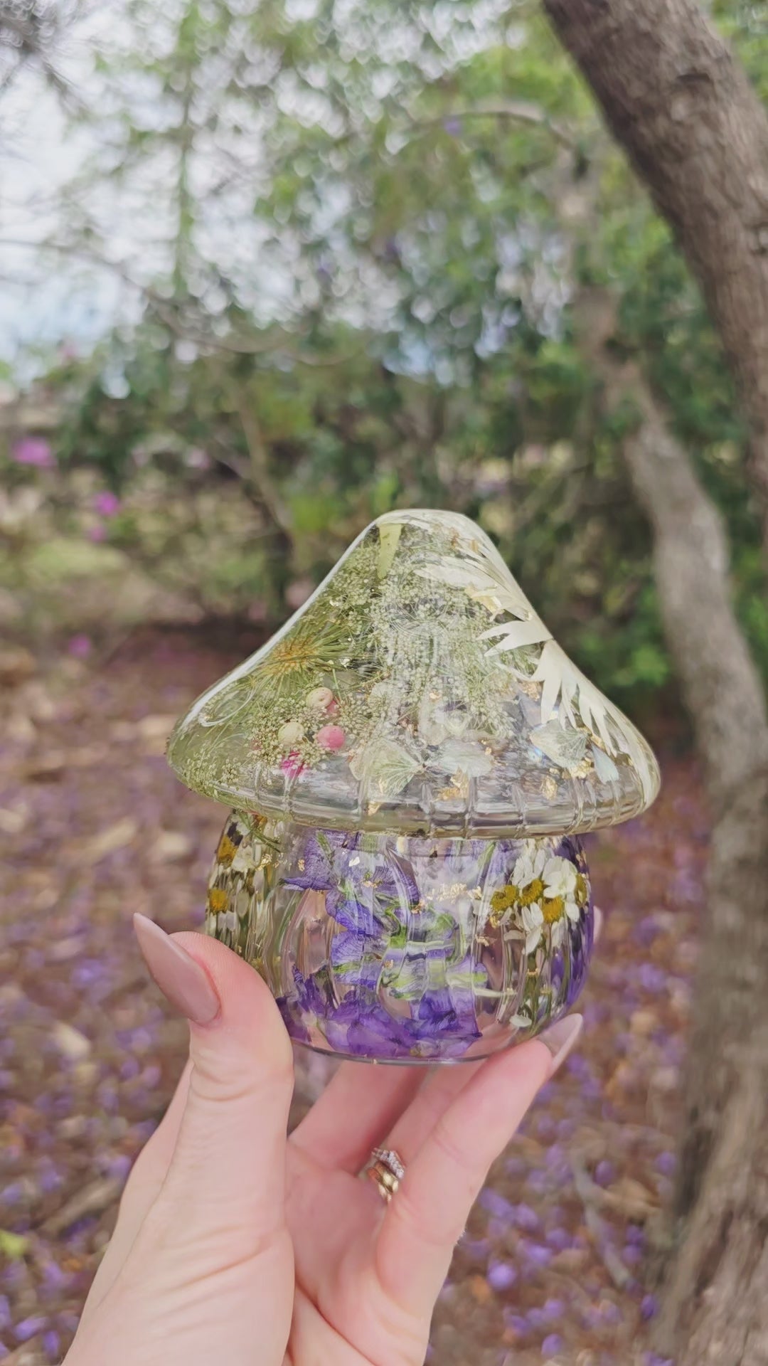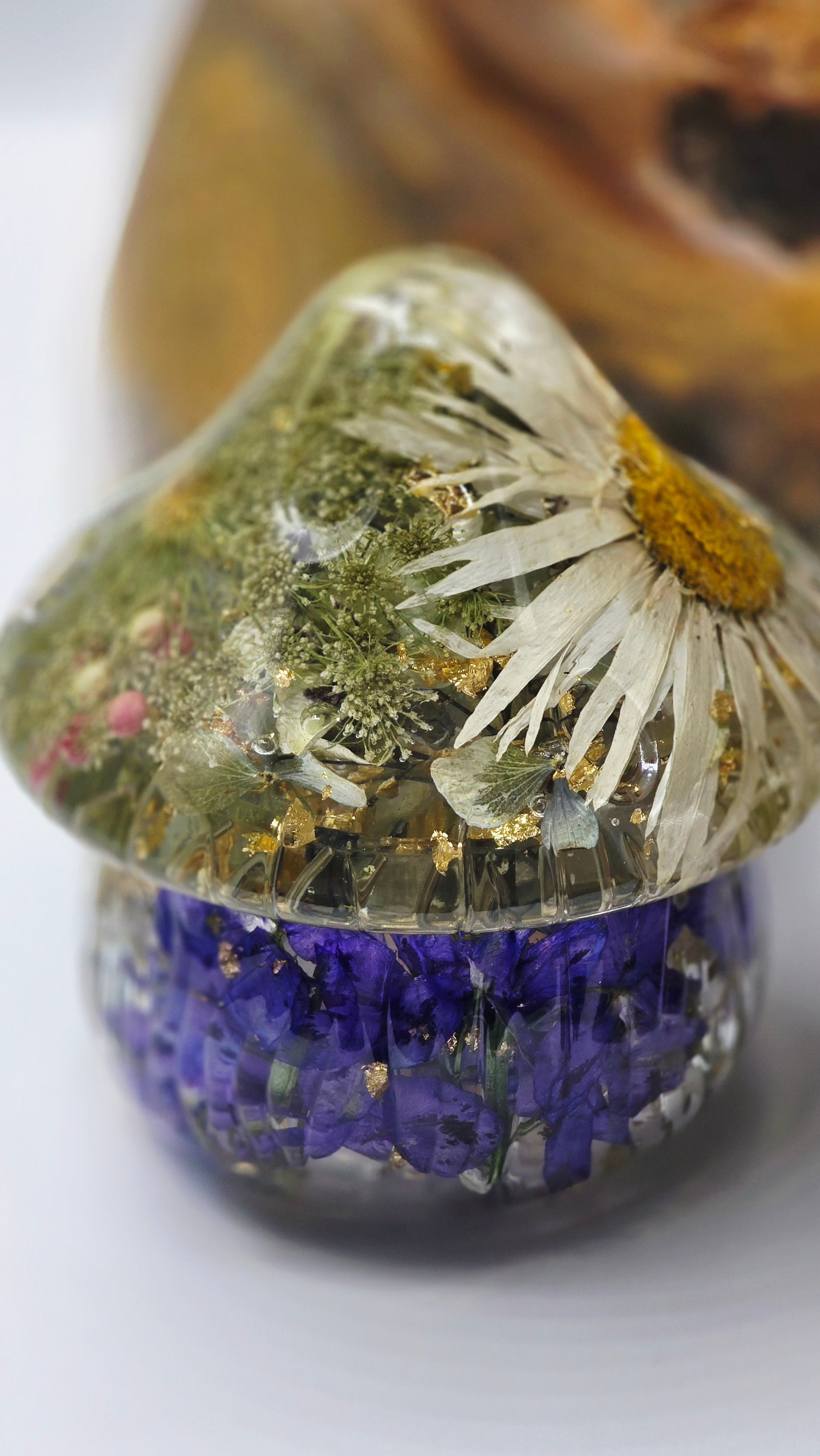#108 - Bring a touch of whimsy and natural beauty into your home with this handcrafted mushroom trinket jar, featuring real preserved flowers embedded in crystal-clear resin. Each jar is a miniature garden, with vibrant blooms encapsulated in the lid and base, making every piece truly one-of-a-kind.