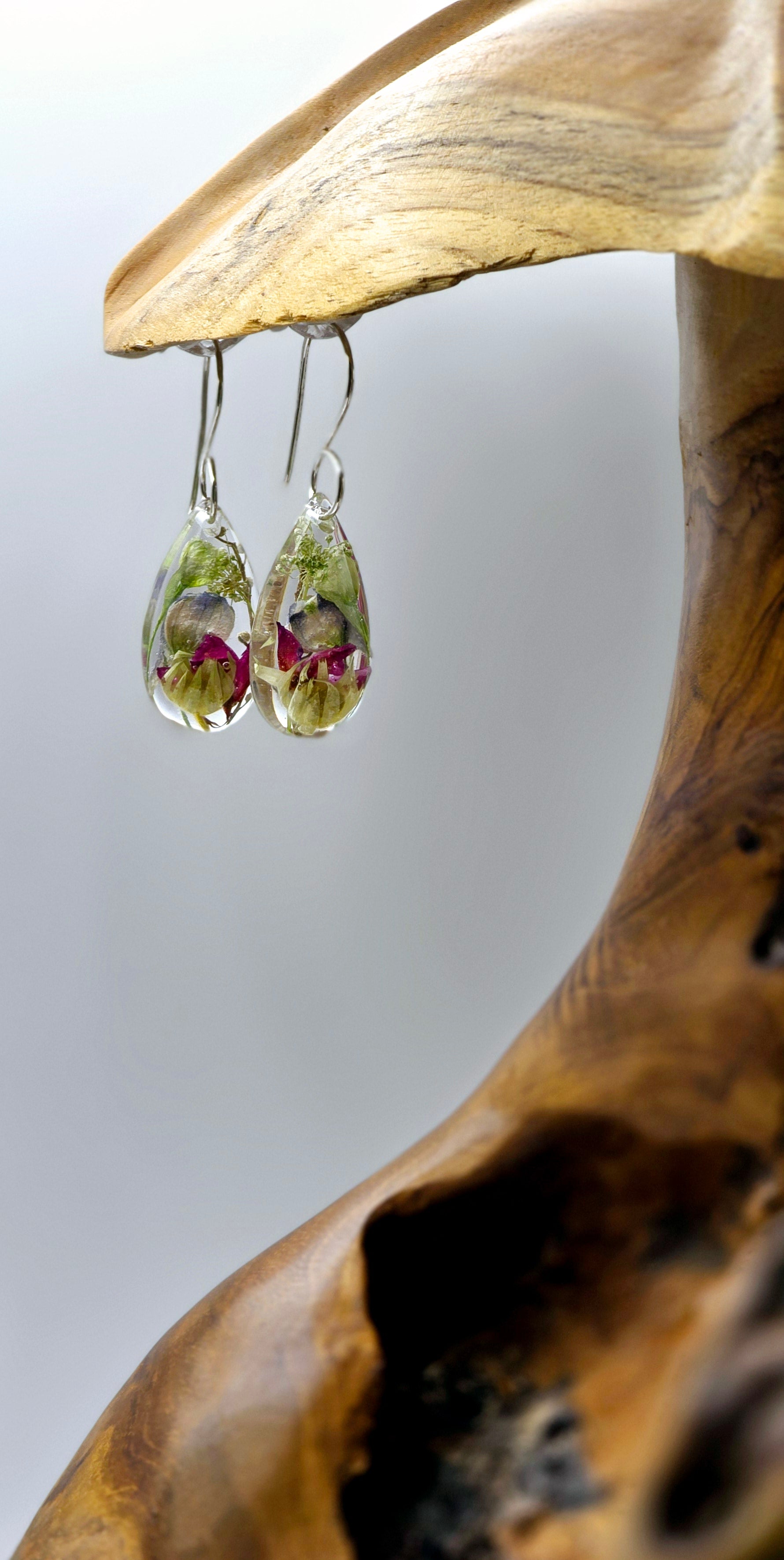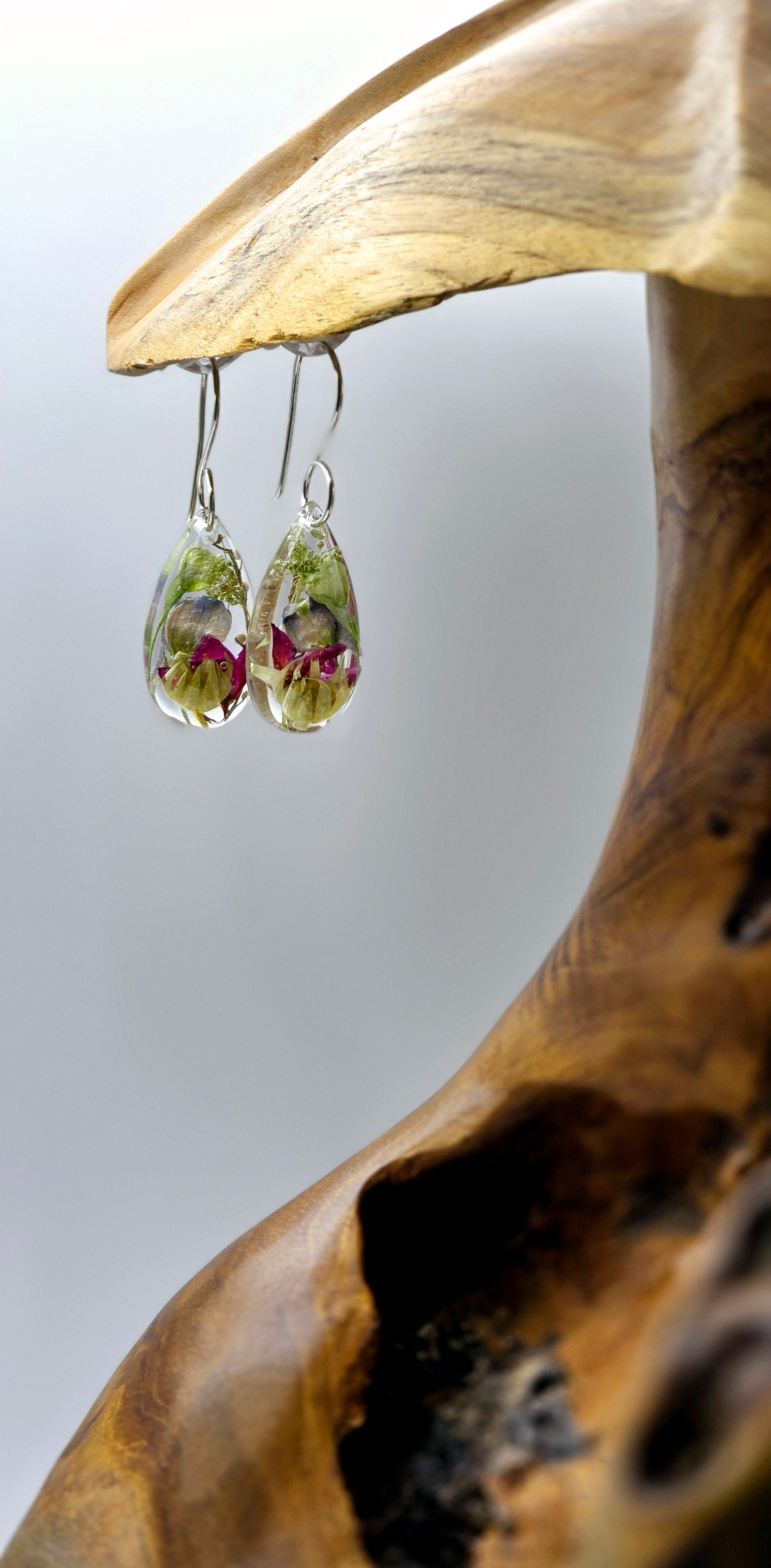 Introducing our exquisite Wildflower Earring Collection, where nature meets elegance. Each pair features one-of-a-kind wildflower specimen arrangements, meticulously preserved in crystal-clear resin to showcase their vibrant beauty. Hanging gracefully from a sterling silver shepherd's hook, these earrings offer a unique blend of artistry and natural charm, perfect for adding a touch of the outdoors to any outfit. Embrace the essence of nature with these stunning, wearable pieces of art that celebrate the beauty of wildflowers.