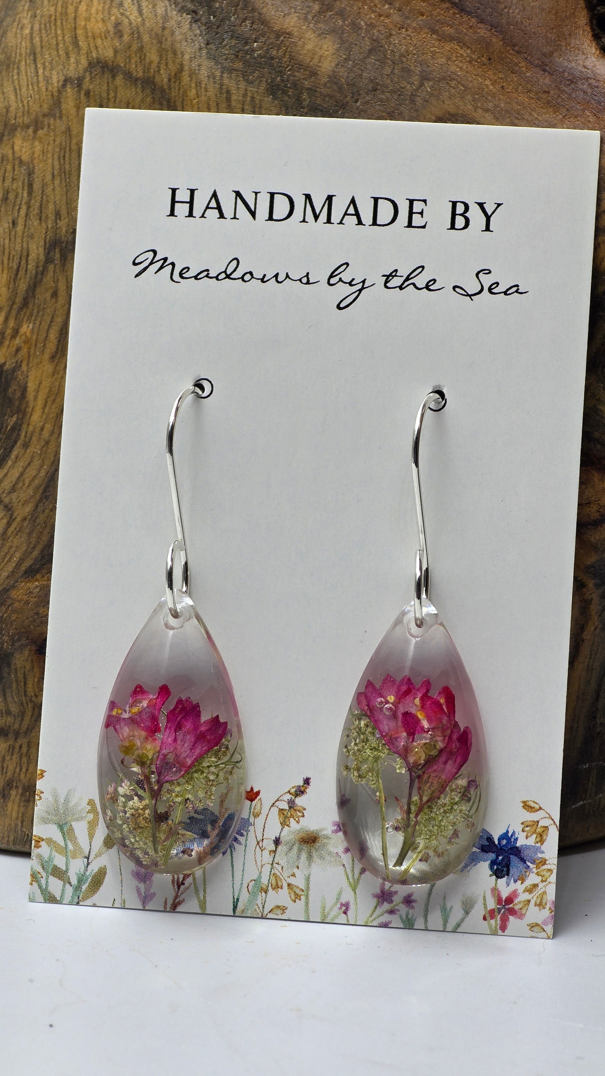 Each pair features a one-of-a-kind arrangement of real preserved wildflowers, delicately suspended in a teardrop-shaped resin pendant and accented with shimmering clarity. The flowers are carefully selected and preserved to retain their natural colour and form, creating miniature gardens that celebrate the fleeting beauty of nature.