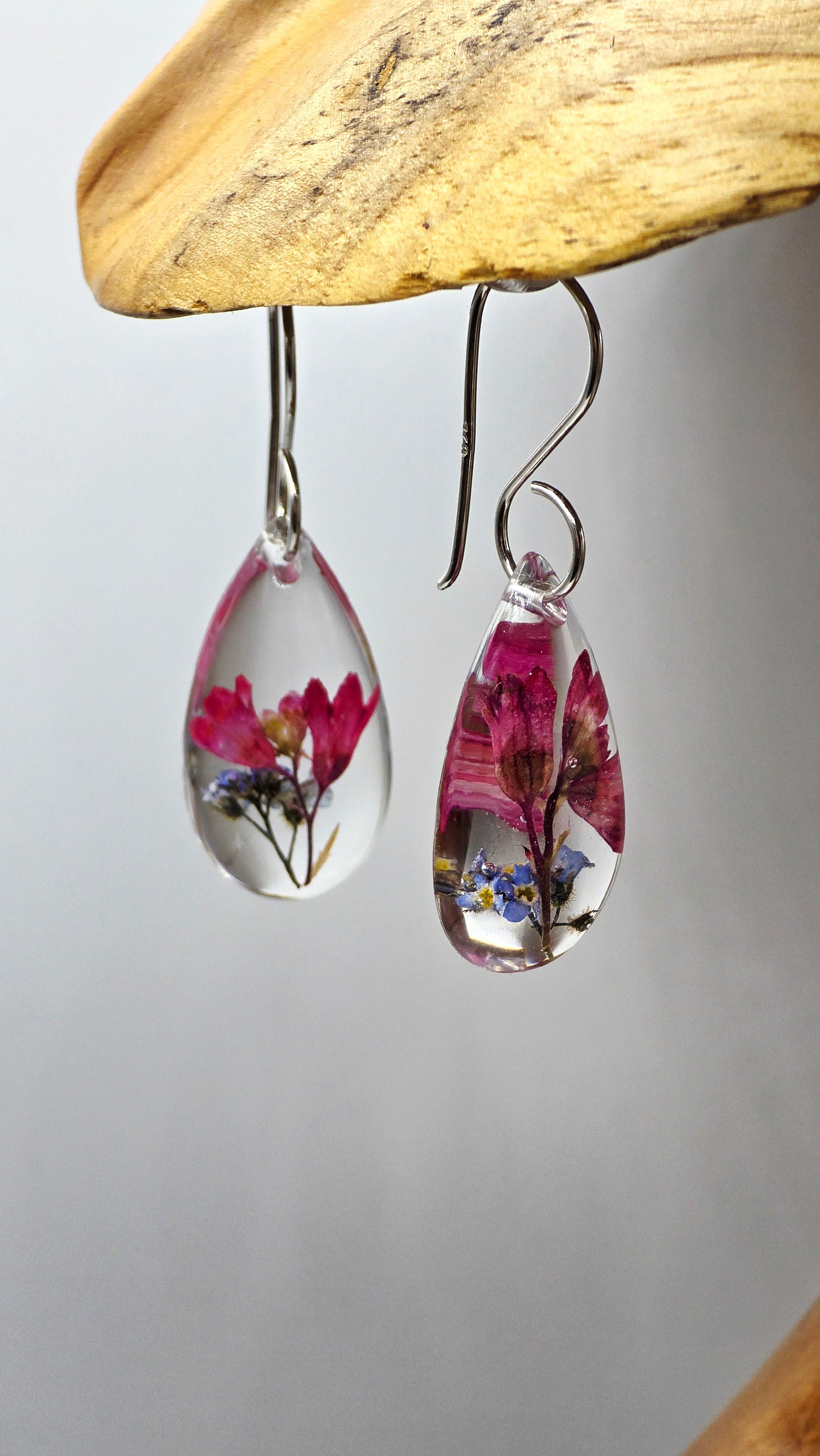 Each pair features a one-of-a-kind arrangement of real preserved wildflowers, delicately suspended in a teardrop-shaped resin pendant and accented with shimmering clarity. The flowers are carefully selected and preserved to retain their natural colour and form, creating miniature gardens that celebrate the fleeting beauty of nature.