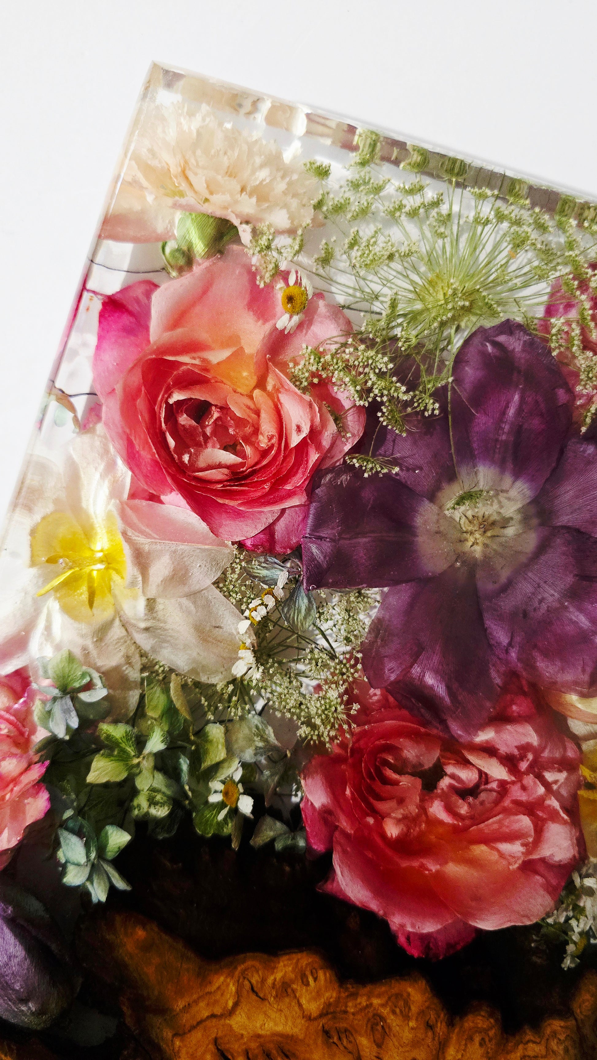 Bring the magic of nature into your home with this handcrafted flower board, featuring real preserved tulips, David Austin roses, dahlias, hydrangeas, and carnations, artfully arranged within rich burl timber and encased in crystal-clear resin. Suspended above the floral display is a real preserved dragonfly, creating a stunning, whimsical focal point that captures the wonder of a garden in full bloom.