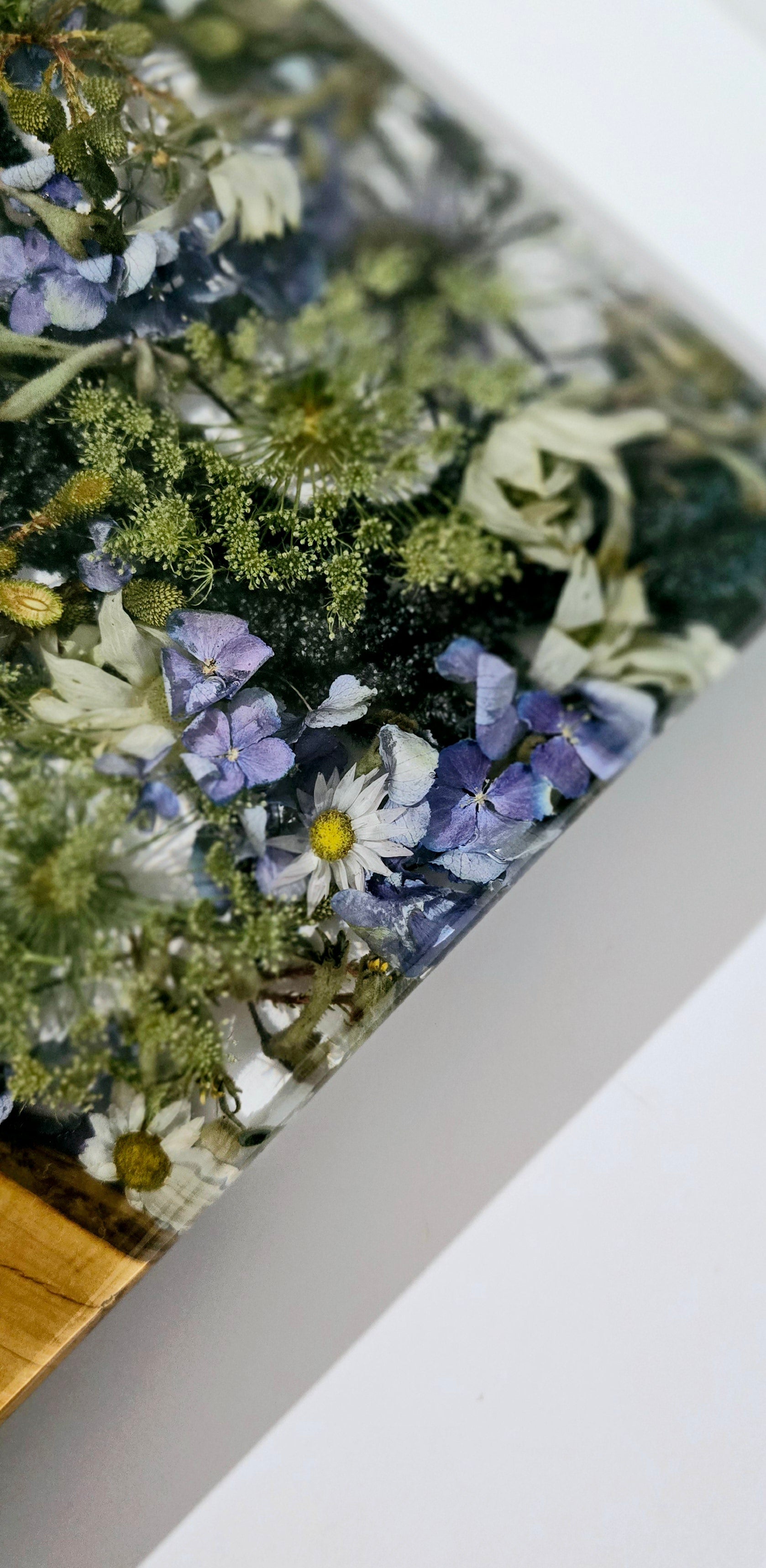 This flower board is a beautiful centerpiece for any table or countertop, measuring approximately 380mm x 280mm. The unique design features real preserved flowers suspended in a clear resin, giving it a stunning and natural appearance. The flowers are carefully arranged to create an eye-catching display that is sure to impress. This lovely piece is not only practical for serving food and beverages, but also serves as a work of art.