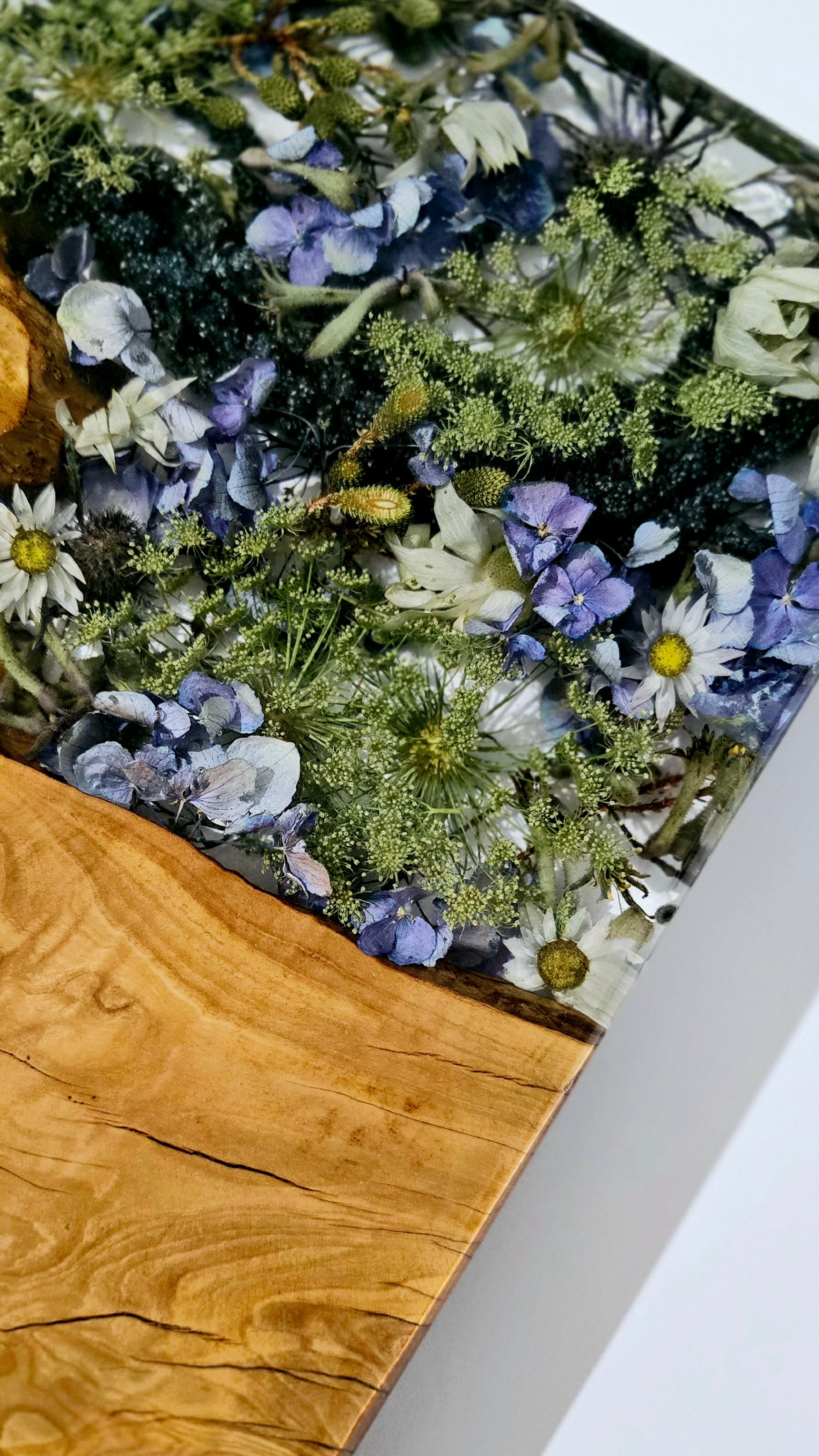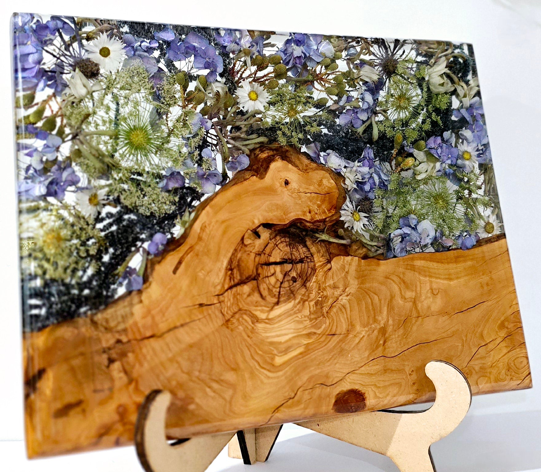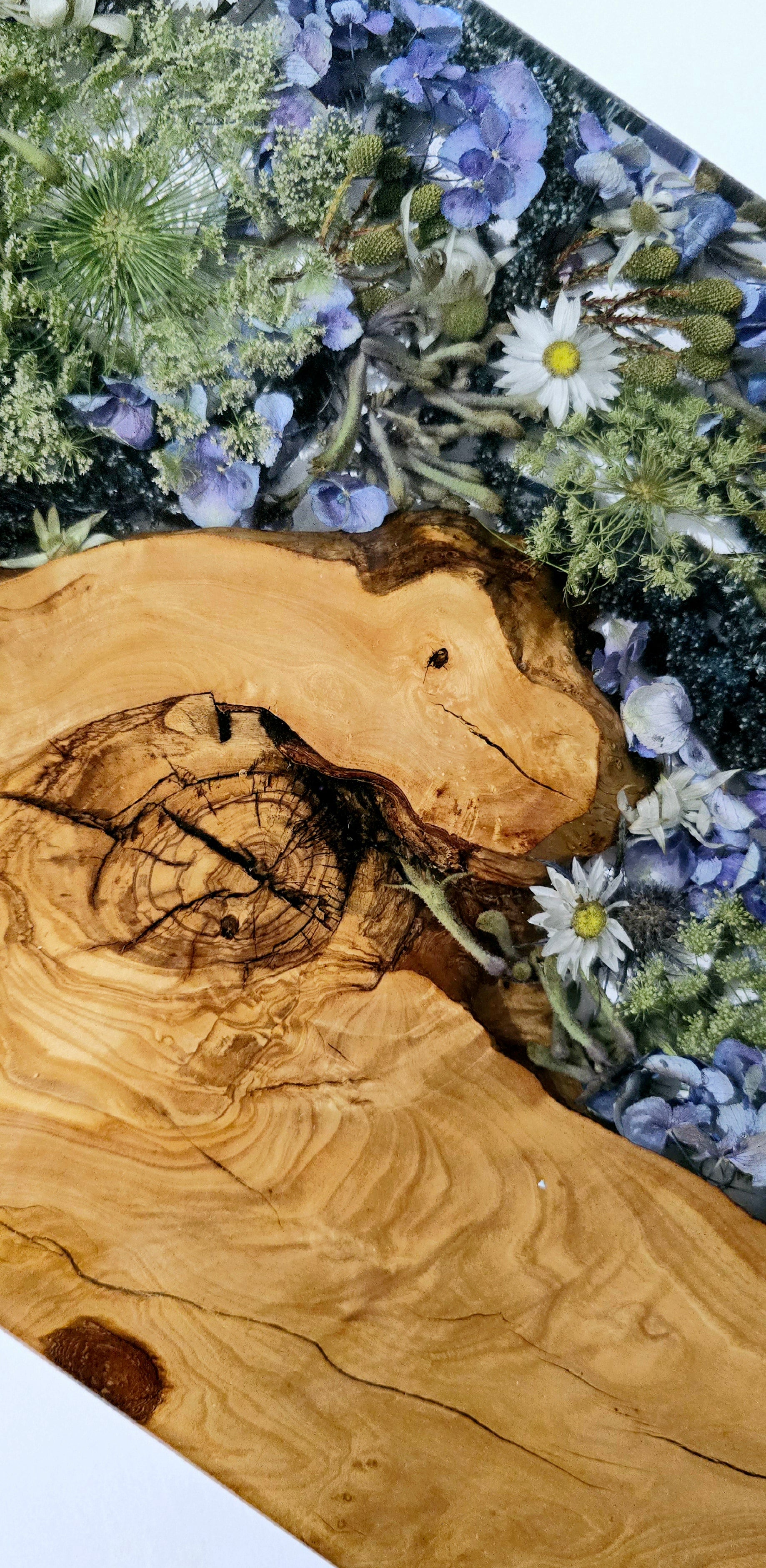 The board features stunning pieces of Olivewood surrounded by real preserved flowers. The flowers are sealed in an FDA approved resin which is food grade below 50degrees celsius.