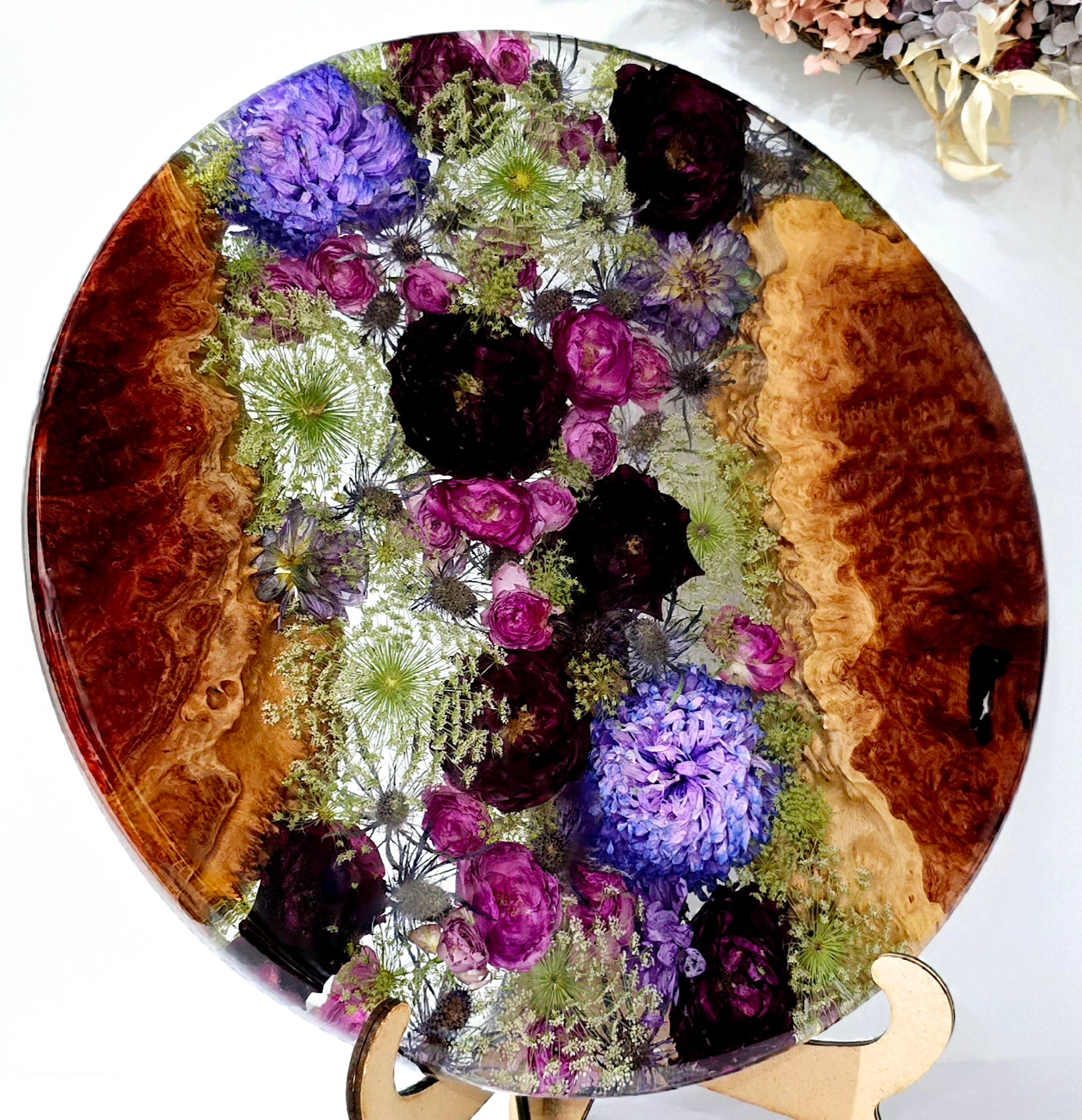 This Lazy Susan is a beautiful centerpiece for any table or countertop, measuring 450mm in diametre. The unique design features real preserved flowers suspended in a clear resin, giving it a stunning and natural appearance. The flowers are carefully arranged to create an eye-catching display that is sure to impress. This lovely piece is not only practical for serving food and beverages, but also serves as a work of art.